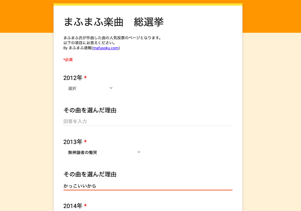 最後の「あなたが一番好きなまふまふ楽曲」という欄は2012年〜2019年に発表された全まふまふ楽曲の中から自分が一番好きな曲を選んでください。