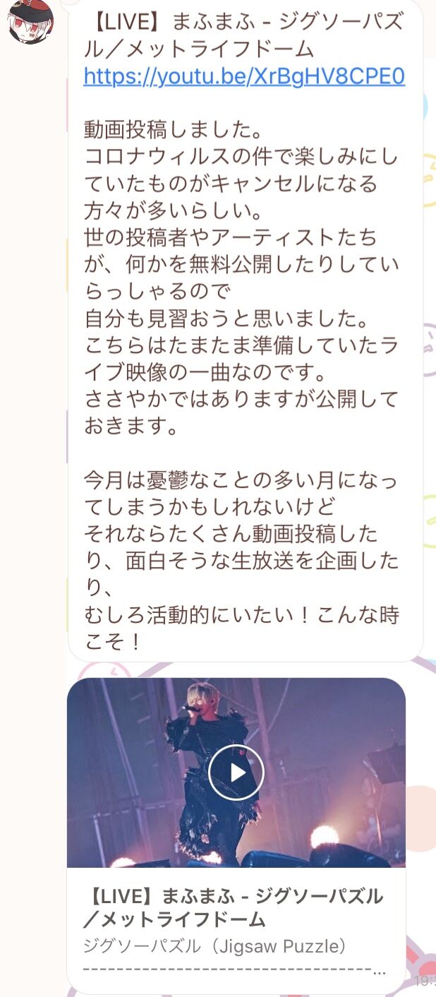 昨年6月22日に開催されたまふまふ氏のワンマンライブ「ひきこもりでもLIVEがしたい!〜すーぱーまふまふわーるど2019@メットライフドーム」の「ジグソーパズル」のライブ映像が公開されました。